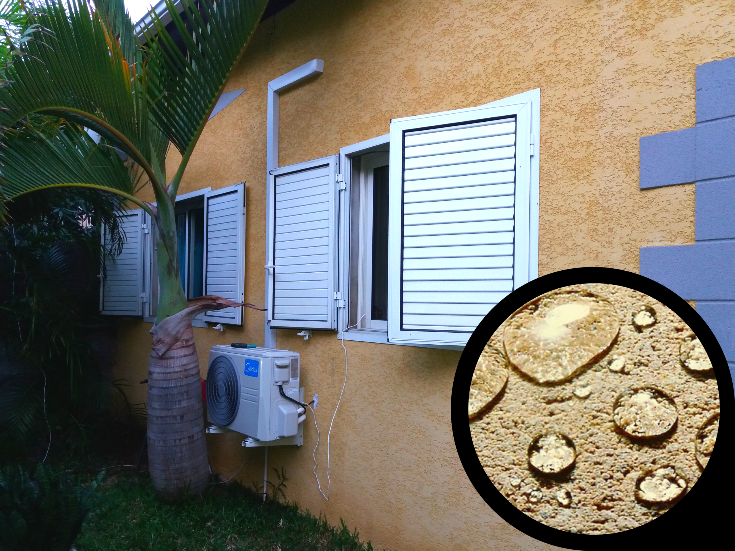 Sur support avec enduit : application d’une résine hydrofuge incolore solvanté pour préserver l’enduit à cœur; Votre façade devient imperméable, avec un effet feuille songe.
